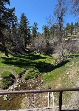 As you’re driving west on US 20 toward Harrison, you see nothing but a bunch of gently rolling hills on either side of the highway. One would never expect a place of such beauty was just beyond those rolling hills. Even as you crest the top of the canyon, you see an amazing sight below: a single lane dirt road running under a canopy of trees, with unusual rock formations atop the buttes, some of which have formed at right angles. The descent is moderately steep, and at times you have a wall of the canyon on your right (descending) and your left (ascending). At the bottom of the canyon is a small, babbling brook that must have taken a few centuries to form the canyon.
